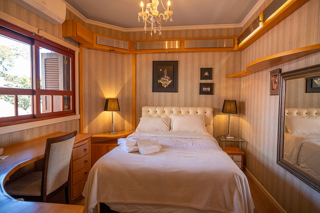 Sofisticação e charme serrano em cada detalhe. Ambiente espaçoso com banheira de imersão, iluminação suave e enxoval de alto padrão.